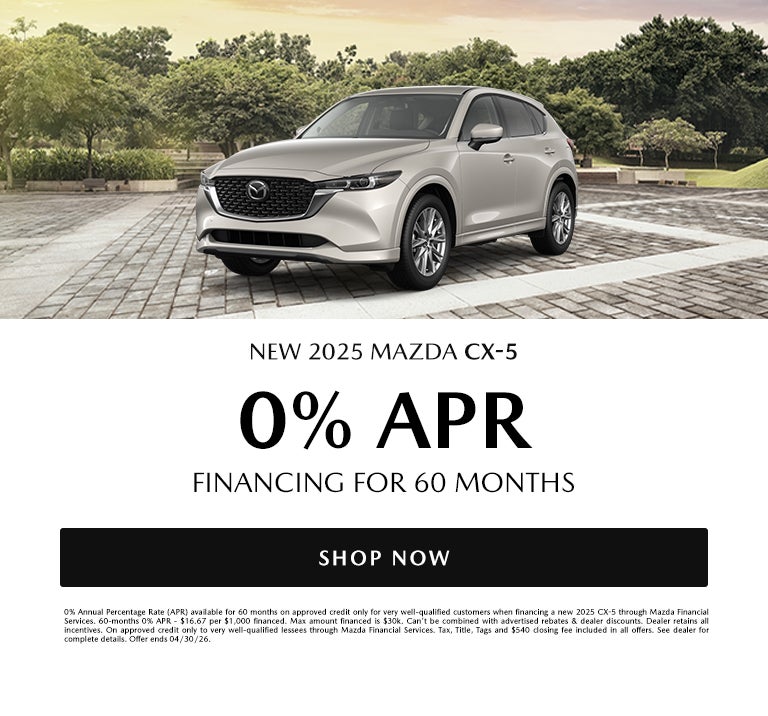 0% Annual Percentage Rate (APR) available for 60 months on approved credit only for very well-qualified customers when financing a new 2025 CX-5 through Mazda Financial Services. 60-months 0% APR - $16.67 per $1,000 financed. Max amount financed is $30k. Can't be combined with advertised rebates & dealer discounts. Dealer retains all incentives. On approved credit only to very well-qualified lessees through Mazda Financial Services. Tax, Title, Tags and $540 closing fee included in all offers. See dealer for complete details. Offer ends 04/30/26.