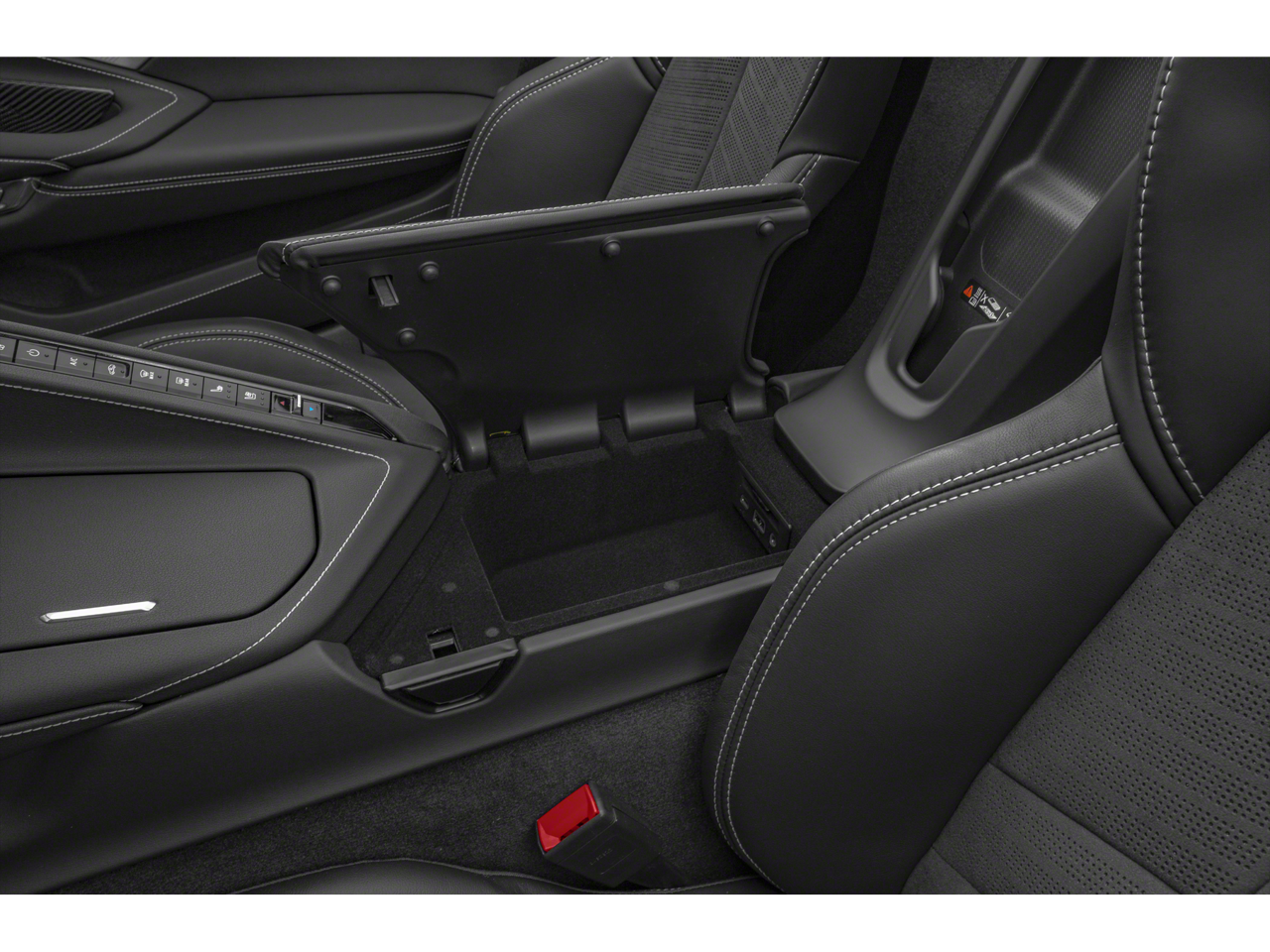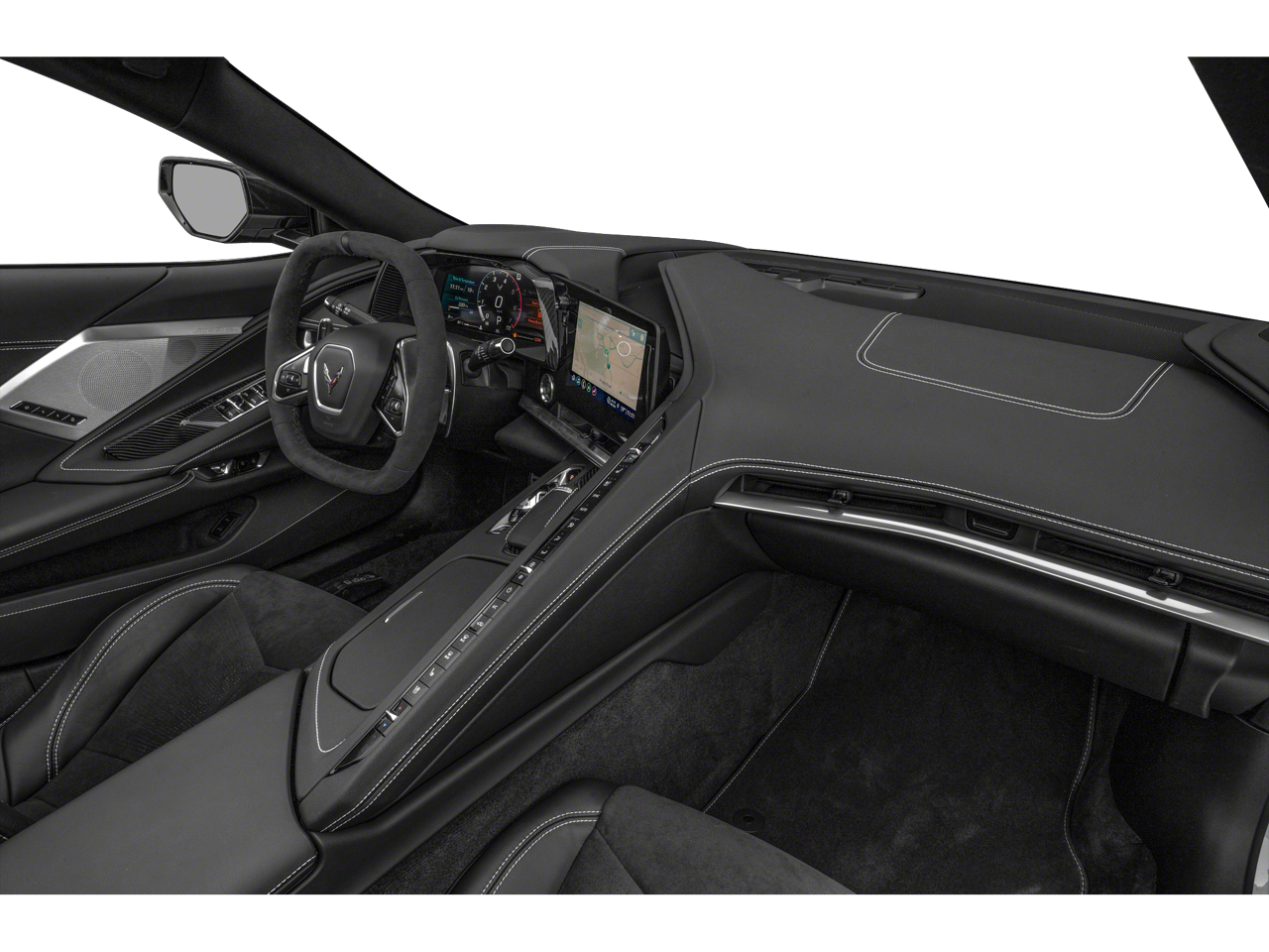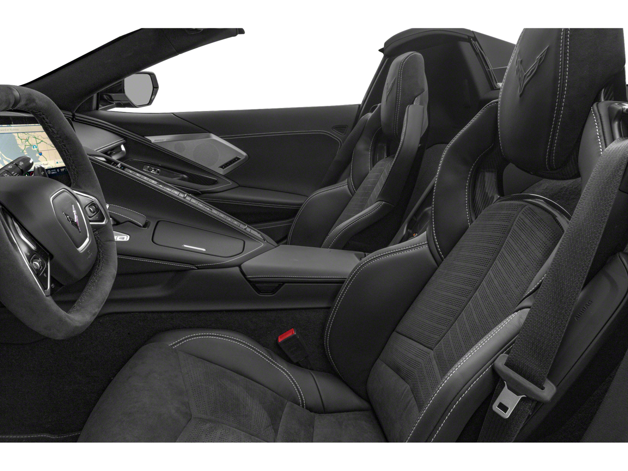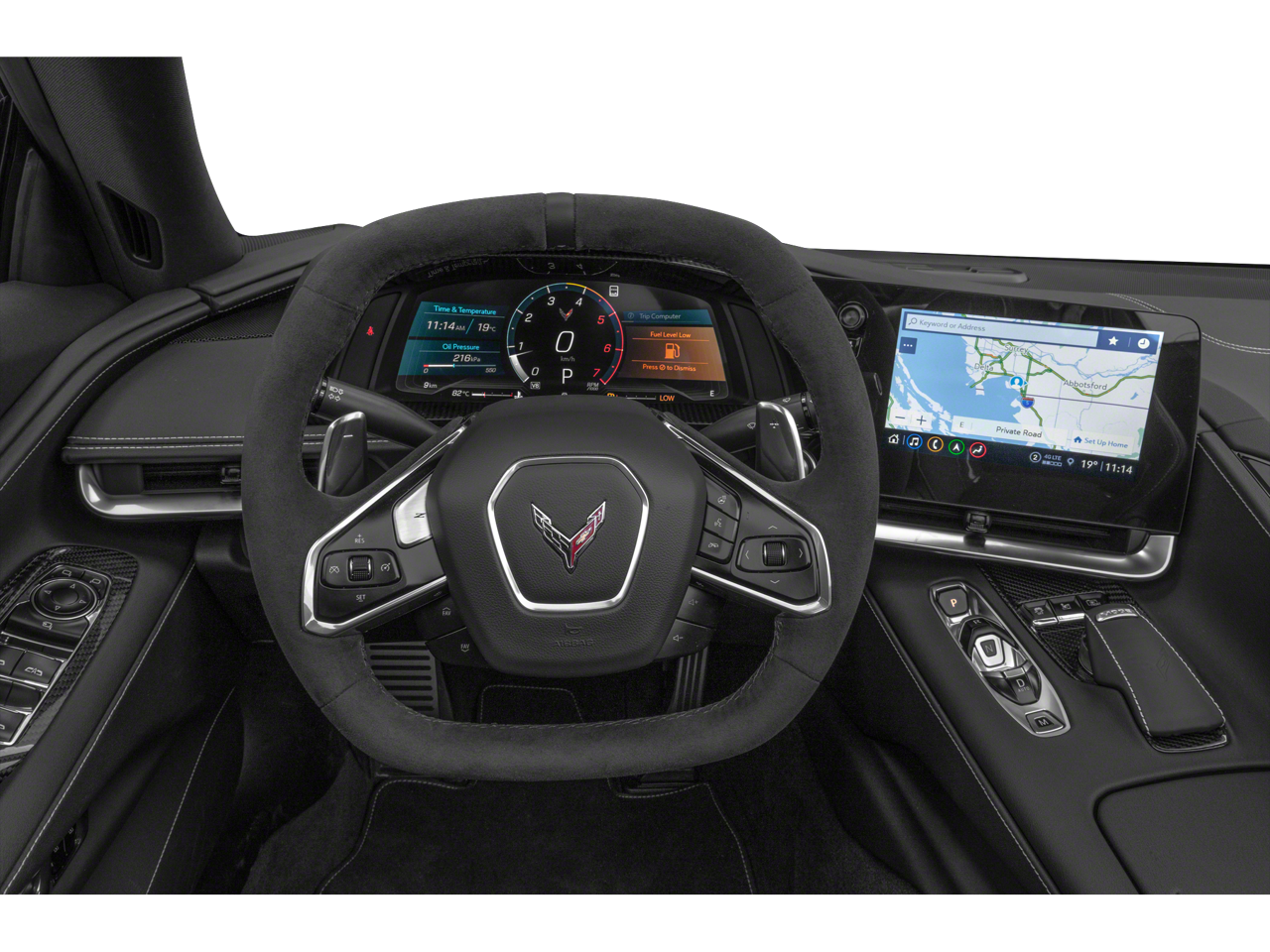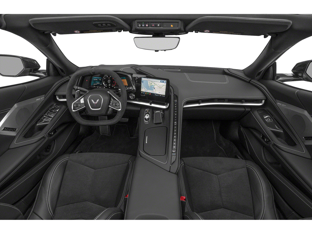 Step inside the Corvette Stingray 3LT, and you'll be greeted by a meticulously crafted interior that blends performance and luxury. The Adrenaline Red Custom Leather Stitch package adorns the seats, instrument panel, doors, and console, creating a striking visual contrast. The Sueded Microfiber-Wrapped Steering Wheel and the Head-Up Display further enhance the driver's experience, providing both comfort and crucial information at a glance.